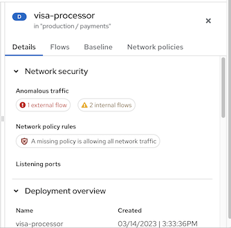 - 查看所选部署可用的部署详情、已观察到的流量信息、基线相关上下文或网络策略相关信息。