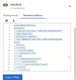 - 当所选资源暴露网络策略数据时,打开可用的策略详情或 YAML 视图。