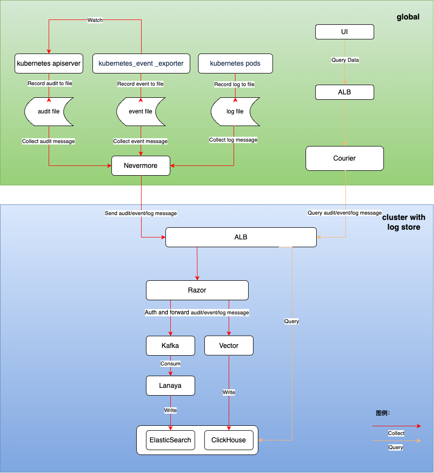 nevermore 采集审计、事件和日志信息后,会将数据发送到日志存储集群,经过 Razor 鉴权后,最终存放到 ElasticSearch 或 ClickHouse 中。