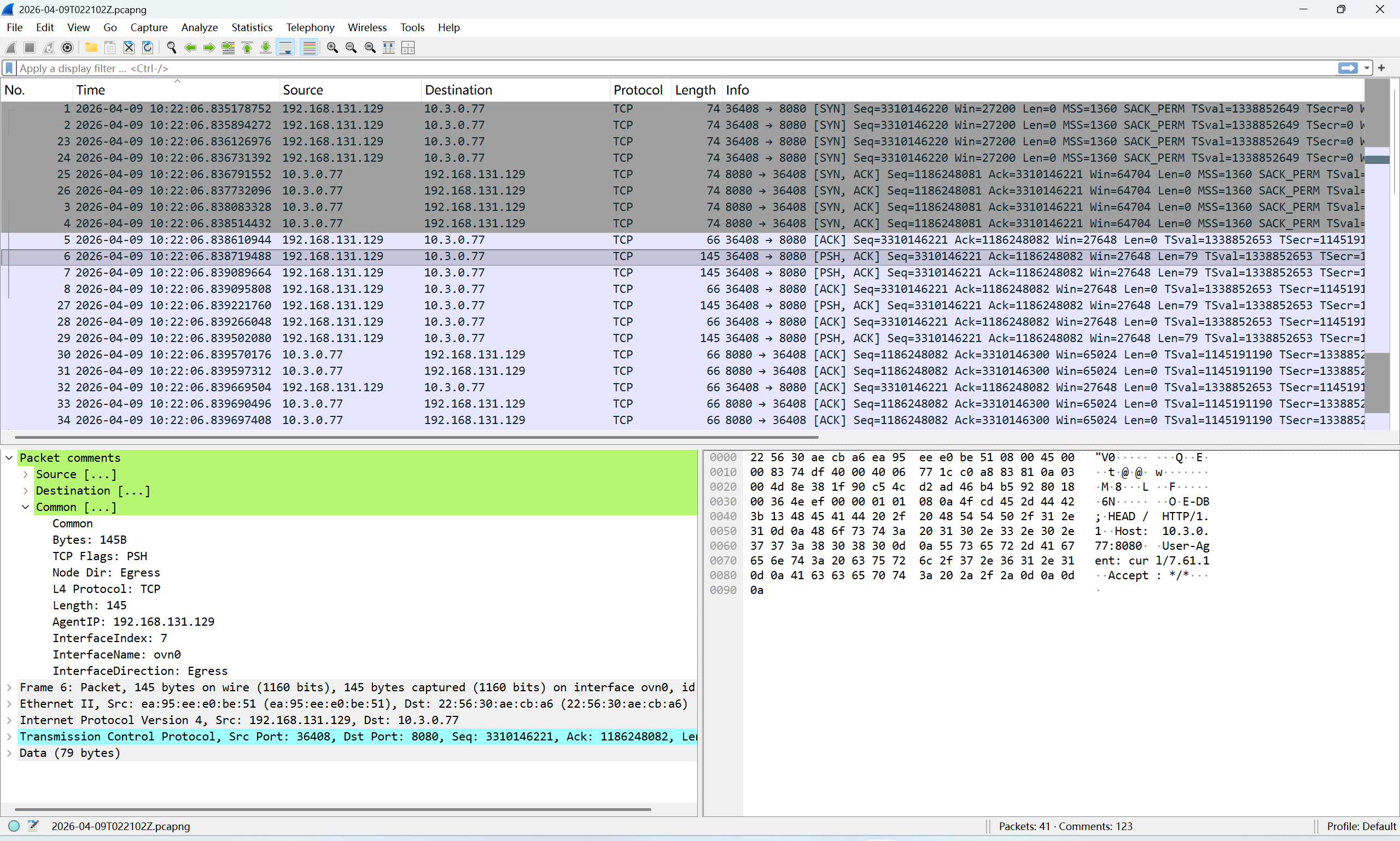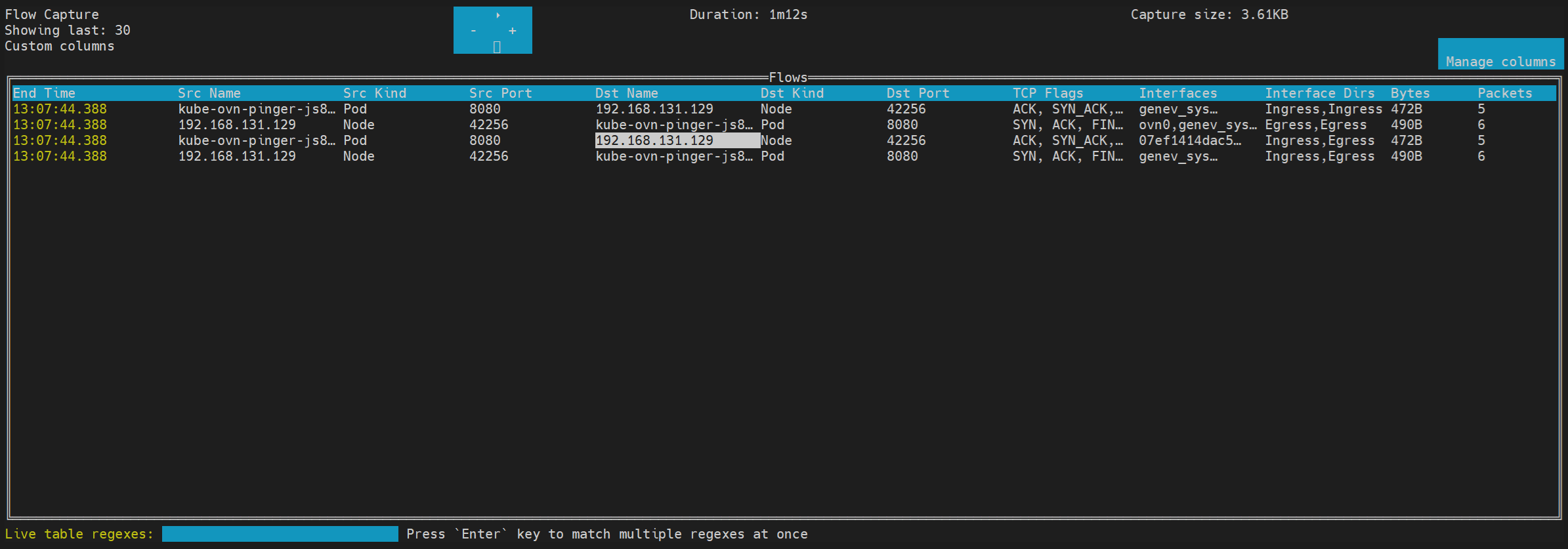 你可以在 Wireshark 中基于这些注释过滤 packets。 以下示例按 node IP 和接口名称进行过滤: