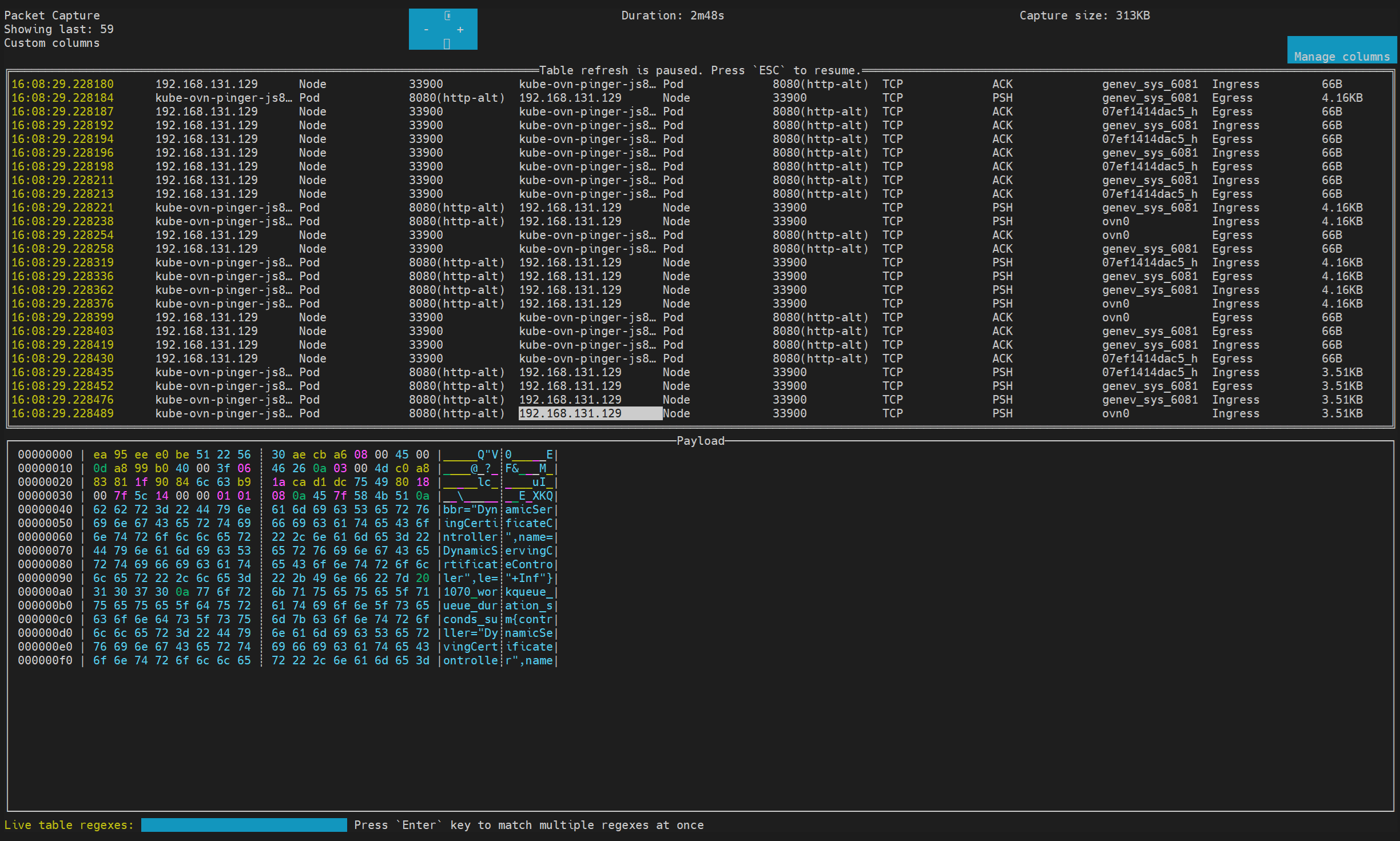 此命令会捕获与指定过滤条件匹配的 packets,并以 TUI 模式显示。