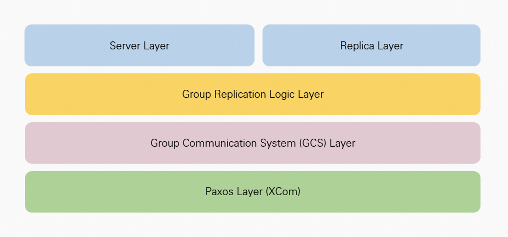 • Group Replication Logic Layer: Responsible for interacting with the Server layer, sending, receiving, and replaying transactions to the Group Communication System Layer.