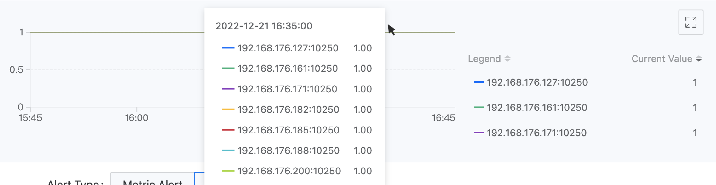For example: The labels of the monitoring data obtained through the expression up{service="kubelet"} include "__name__":"up","endpoint":"https-metrics","instance":"192.168.18.2:10250","job":"kubelet","namespace":"kube-system","node":"192.168.18.2","service":"kubelet". If you want to use the target endpoint that collects data as the legend identifier, you can enter the legend parameter {{.instance}}. The display effect is as shown in the following figure.