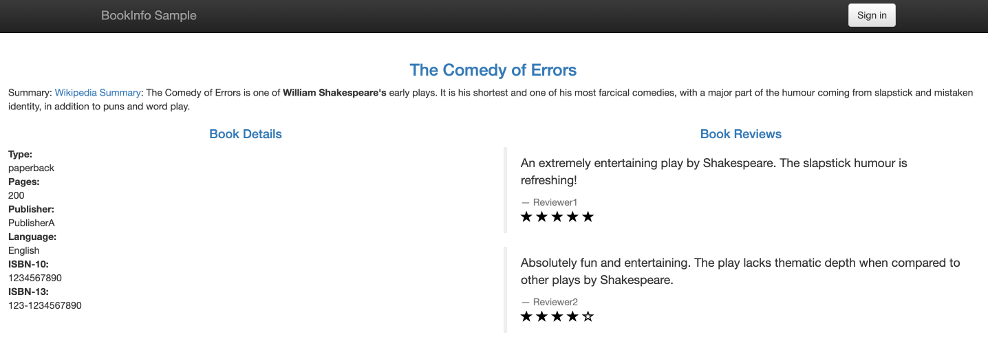 Bookinfo is a sample application provided by Istio that mimics an online bookstore. It consists of four separate services that together provide the functionality of viewing a book's description, book details (ISBN, number of pages, etc.), and some book reviews.